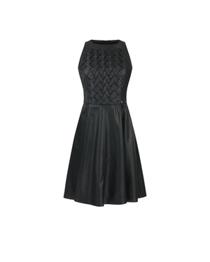 Elegant feminine sleeveless dress, round neckline, fitted top with interlaced leather straps and flares along the length. Can be combined with a matching jacket from the collection.