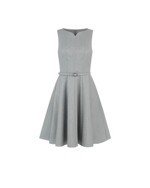 Stylish dress with a structured silhouette, round neckline with a V-cutout, sleeveless design, fitted bodice, and flared skirt. Accented with an elegant textile belt with a buckle and a refined lining, the fabric features lurex fibers that provide a subtle, sophisticated shimmer.