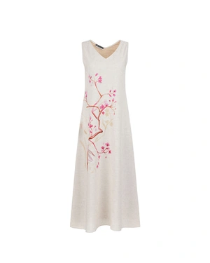Model with V-neckline, sleeveless, regular fit with flare along the length, ankle-length, made of certified viscose and linen, lined with viscose. This garment contains certified viscose, meaning the viscose comes from sustainably managed plantations that