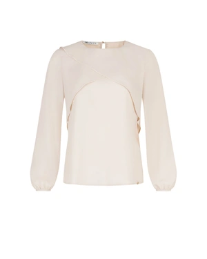 მოდელი მრგვალი დეკოლტეთი, სტანდარტული მორგებითა და გრძელი სახელოებით, საინტერესო დეტალით დეკოლტეზე