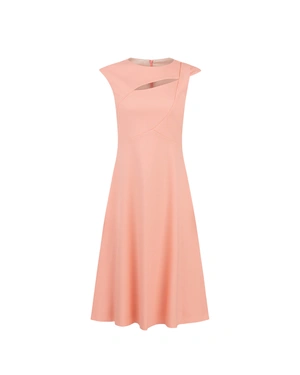 ელეგანტური ქალის კაბა სუფთა სილუეტით, შესაფერისი ოფისის იერსახისთვის. მოდელი წარმოდგენილია გაზაფხულის ახალ ტონში - ატმისფერ-ვარდისფერში. მას აქვს მრგვალი დეკოლტე, სახელოები, მოჭერილი ბოდი და გაშლილი ქვედაბოლო დეკოლტეზე დეკორატიული ამოჭრით; შეიძლება შეუხამოთ კოლექციის ქურთუკს.