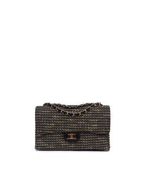 ჩანთა გამოირჩევა სუფთა, სწორკუთხა ფორმით და დახვეწილი ფლაპით, რომელიც ელეგანტური მეტალის მექანიზმით იხურება. ოქროსფერი ჯაჭვი მატებს მდიდრულ ელფერს, ხოლო კომპაქტური, თუმცა პრაქტიკული ზომა იდეალურია საღამოს გასვლებისთვის და ყოველდღიური ელეგანტურობისთვის. დამზადებულია ტექსტილისა და ტყავის კომბინაციით, ზომა — 15x27x10 სმ. შესაძლებელია კომბინირება კოლექციის შესაბამის ქსოვილის ტანსაცმელთან.