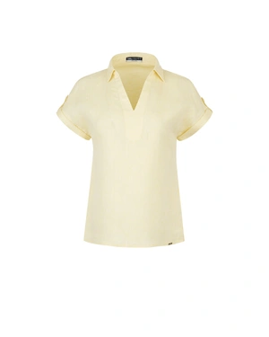 ზაფხულის განწყობა და ბუნებრივი სიგრილე. ეს 100% სელის ბლუზა ზაფხულის კომფორტის განსახიერებაა. კლასიკური საყელოთი, მოკლე სახელოებით და ჩანართებით, რბილი ყვითელი ელფერით - ის შესანიშნავი გადაწყვეტაა როგორც ოფისისთვის, ასევე შაბათ-კვირის ბუნებაში გასეირნებისთვის.