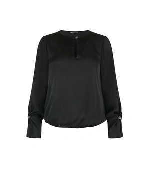 ელეგანტური მოდელი გრძელი სახელოებით, მრგვალი დეკოლტე ცრემლის ფორმის ჭრილით და დეკორატიული დეტალით, ელასტიური მანჟეტებითა და ქვედა კიდეებით