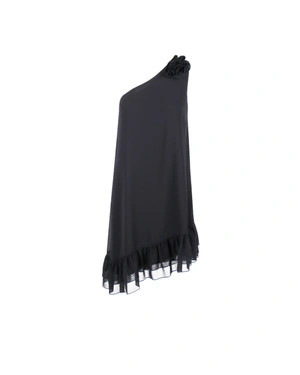 ქალის ორფენიანი კაბა, დამზადებული შავი, წვრილი შიფონისა და ვისკოზის შიდა ნაწილისგან, ერთი მხარით, ვარდის დეტალით და ქვედა ნაწილში ფრიალა ნაკეცებით.