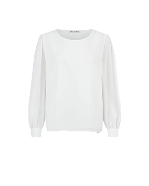 ჰაეროვანი თეთრი ბლუზა ფართო, თავისუფალი მორგებით და მრგვალი ყელით, მანჟეტებით მორთული მკლავებით, მსუბუქი და ადვილად შესახამებელი ყოველდღიური ტარებისთვის.