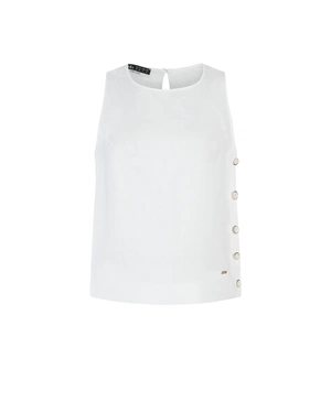 სიახლე და ნაზი აქცენტი. უსახელო სუფთა სელის ბლუზა, გაფორმებული გვერდითა ღილებით, რომლებიც კლასიკურ თეთრ ზაფხულის დიზაინს თანამედროვე იერს სძენს.